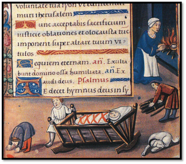 All over the world there are two main forms of infant carriers, hard carriers and soft carriers. Hard carriers are made of harder materials and usually can contain the infant whether or not a caregiver is carrying it. Today, portable car seats are a kind of hard carrier; in the medieval era we see babies strapped into wooden cradles like the image above or piled into wicker baskets. There are also soft carriers are usually made of fabric (leather or textiles) which require the support of the caregiver’s body to contain the infant, in the middle ages a common soft carrier was fabric wrapped around the body and tied at the shoulder to form a sling.