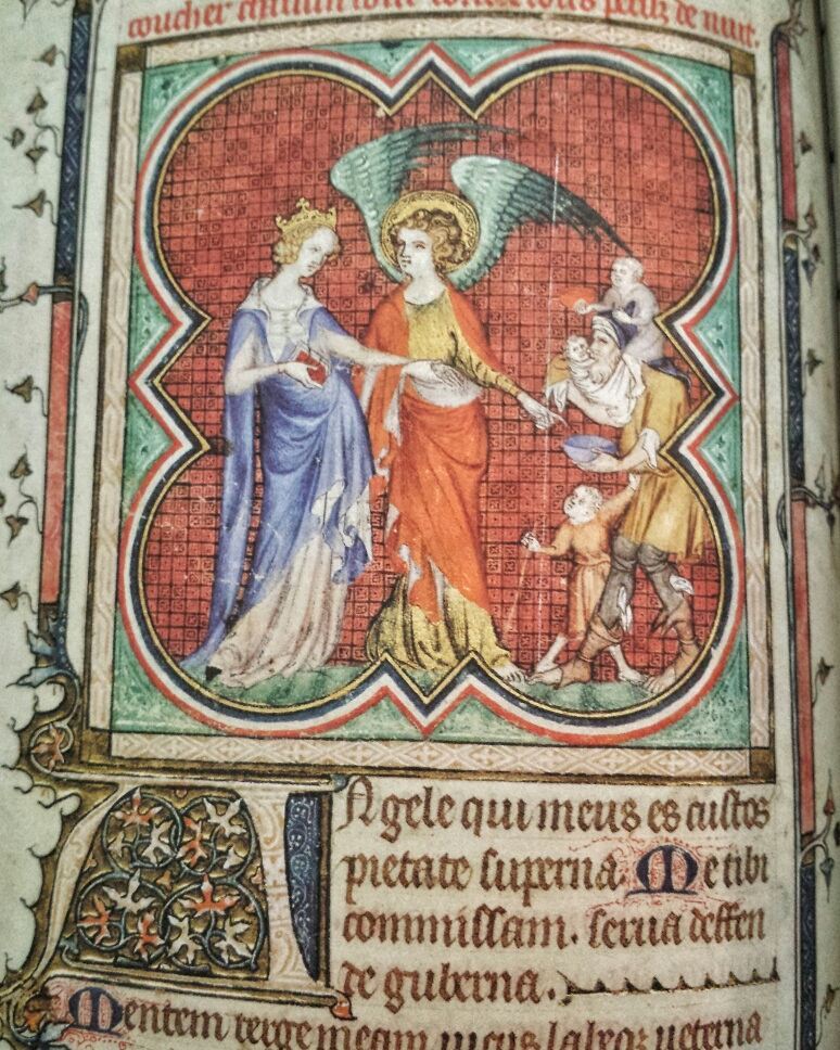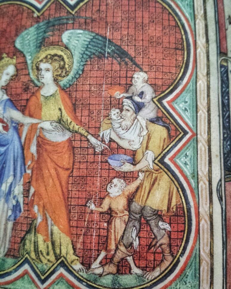 In some jurisdictions, beggars needed licenses which could take the form of badges or metals attached to their clothing. In this image, it’s almost as though this man’s license to beg is the baby, therefore a front carry is preferable to a back carry, as back carries obscure the infant from approaching people. However, since this beggar has a toddler and another young child to carry, it is wise to save the back carry position for the heaviest child, so this could have been a how real people were seen carrying babies in 14th century France.