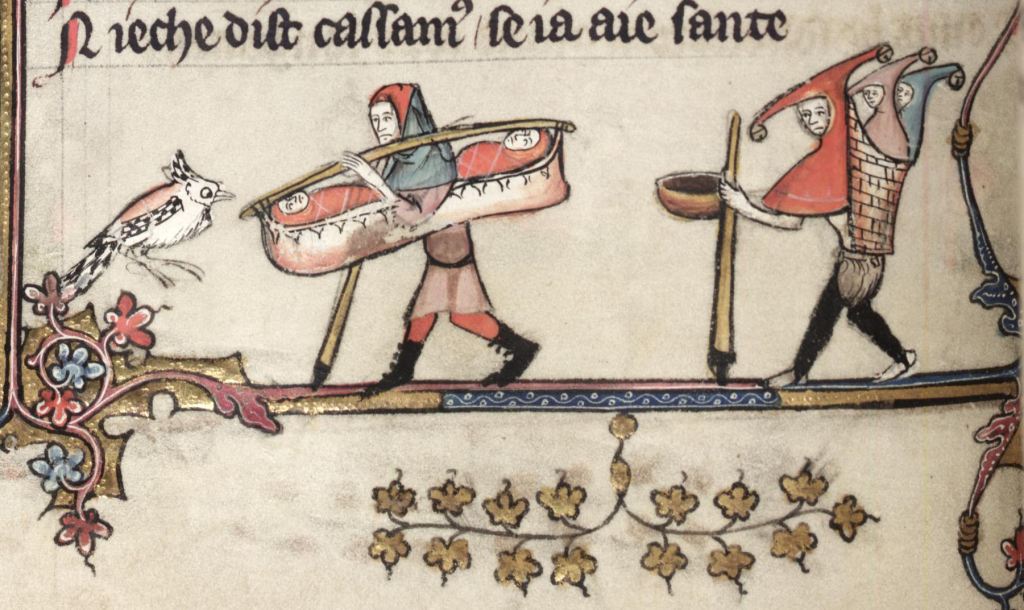 In the MS Romance of Alexander, the artist Jehan de Grise of Flanders depicts twin-infant-carriers. The first carrier appears to be a kind of narrow leather or cloth bag suspended from a wooden pole, both infants swaddled and set in feet to feet. Behind them, a man walks with two children in a basket on his back. These carrying objects were not specifically infant carriers, they would have been general carrying tools for transporting items, including firewood or food.