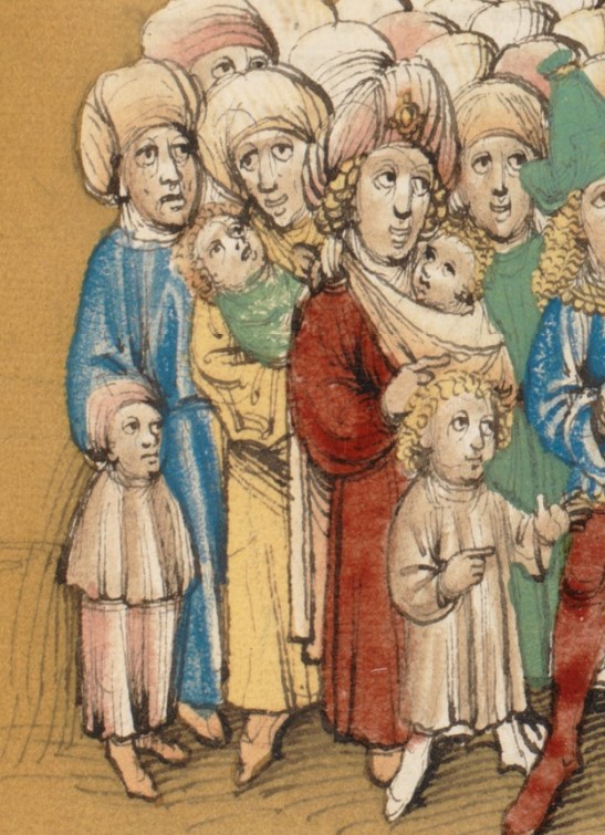 The First Arrival of the Gypsies to the City of Berne, from the Spiezer Chronicle (Swiss Chronicle) from 1485 is contemporary to the Torture of Jewish Mothers. In Gypsies, we can see a member of the crowd is seen using a simple cloth sling, tied at the neck, but the infant is upright, and the sling supports them from the neck down. Perhaps the sling use seen in Jewish Mothers above demonstrates the typical daily use of the sling to aid in hands-free breastfeeding, whereas the sling use depicted by the Gypsies is more in line with how slings were used for travel.