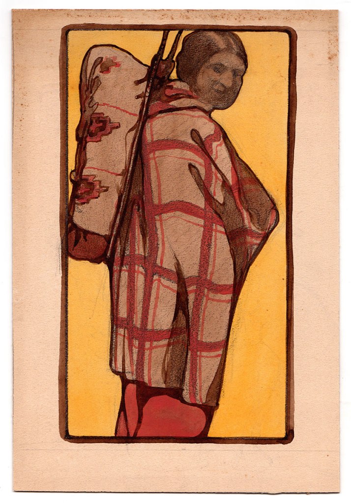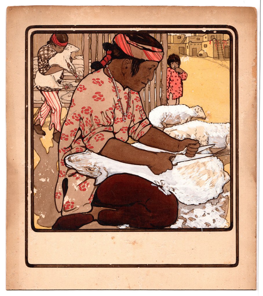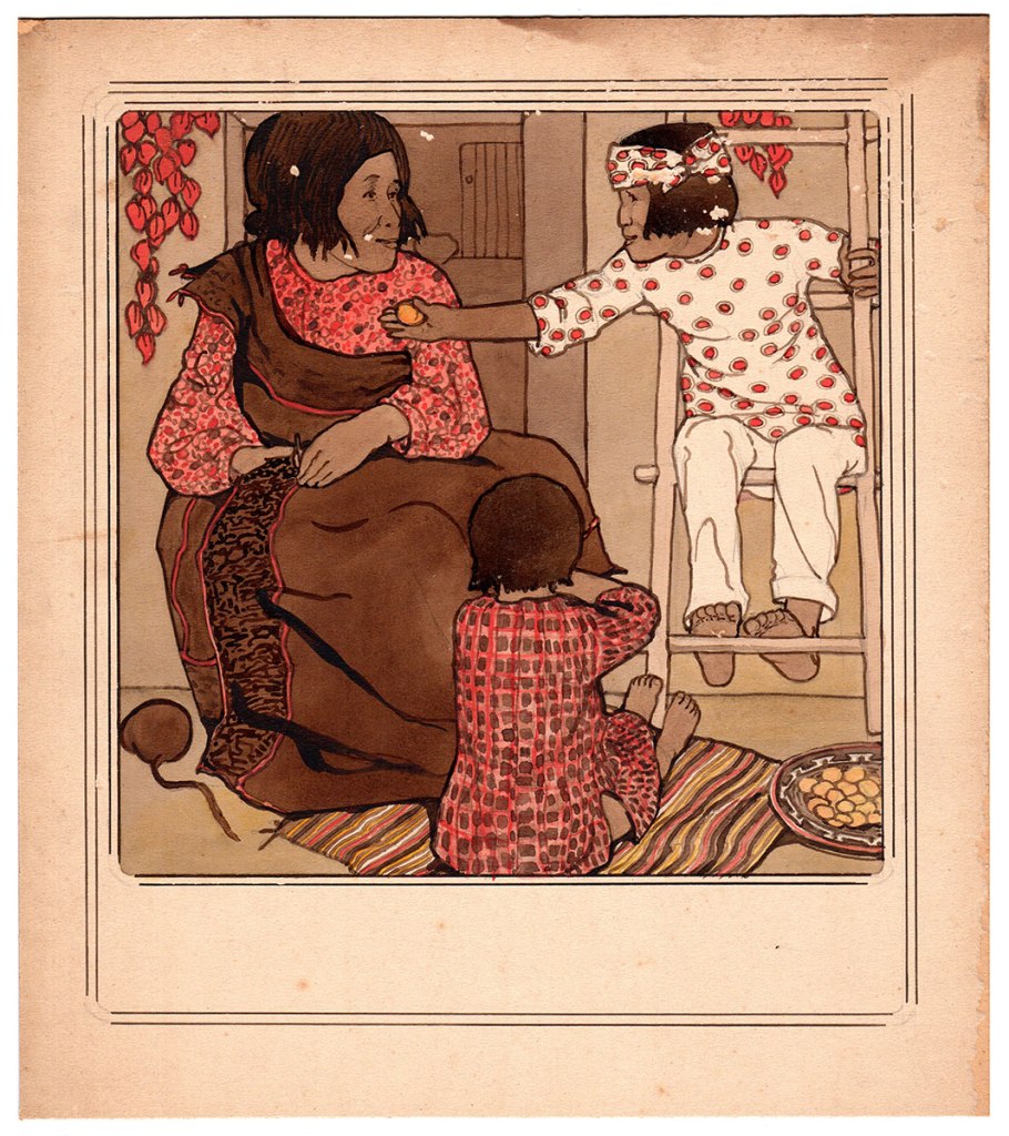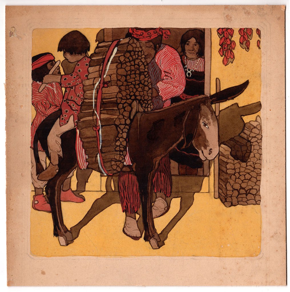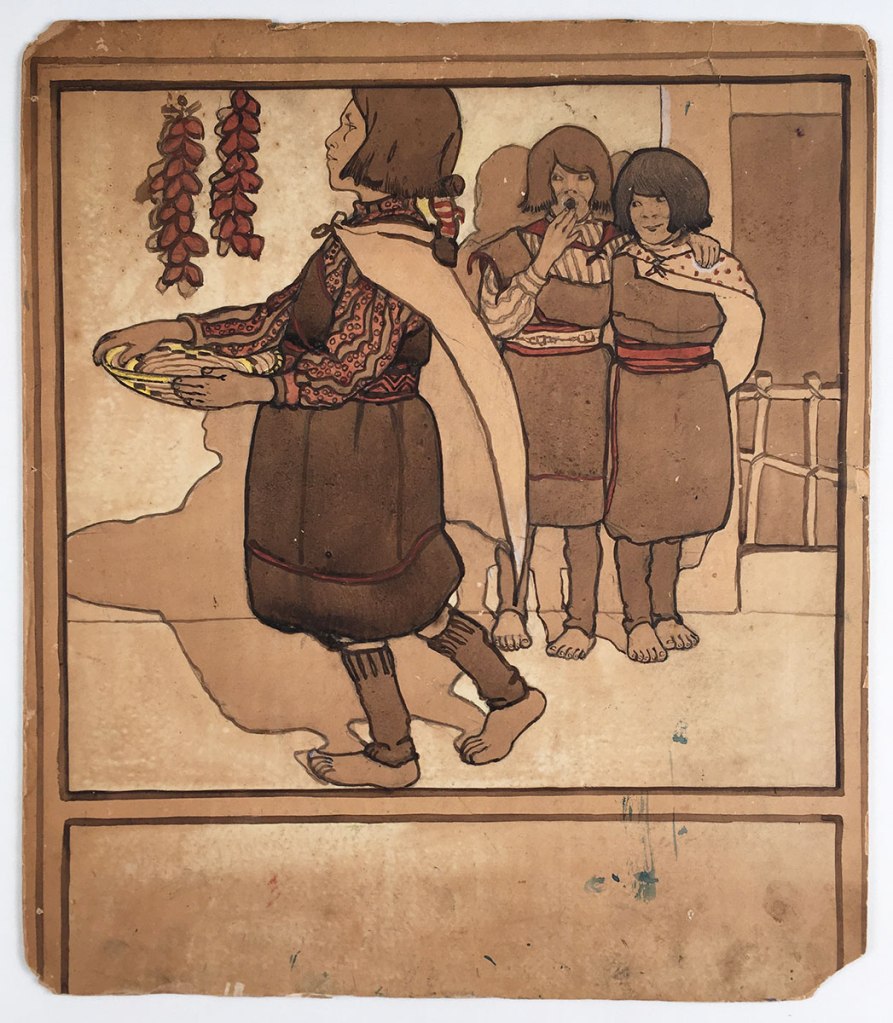 Beatrice was inspired by the culture of the Zuni Pueblo. In 1901, she produced a series of watercolors and charcoal sketchings of the Zuni people which may have been intended for a book that was never completed. She made special note of mothers with children, including infants in carriers. Frequently the idealized western family dynamic: helpmeet mother, breadwinner father, and children who “work and play”, were emphasized in the scenes she recorded. Beatrice wasn’t working as an anthropologist, rather she interpreted Zuni culture through her own romanticized ideas of rural family life in the American West. However, we can still gain valuable historical information from her artwork about both Zuni and Beatrice’s culture.