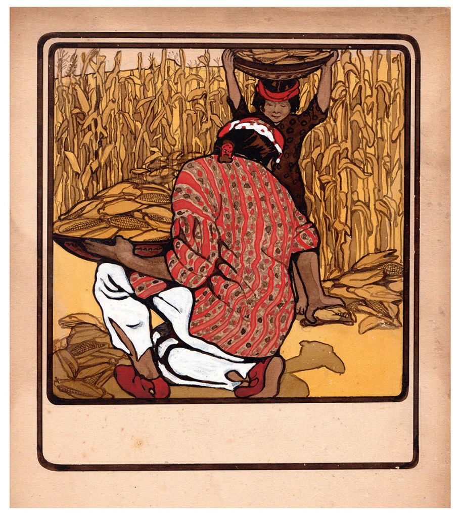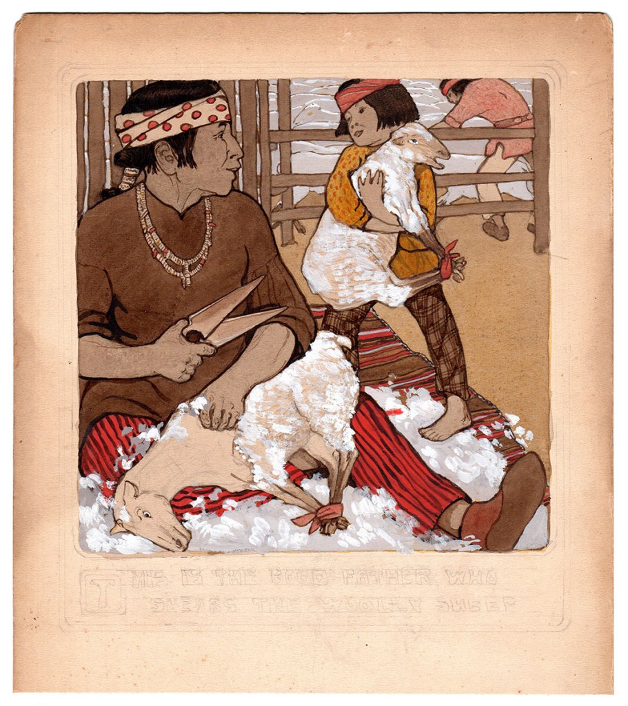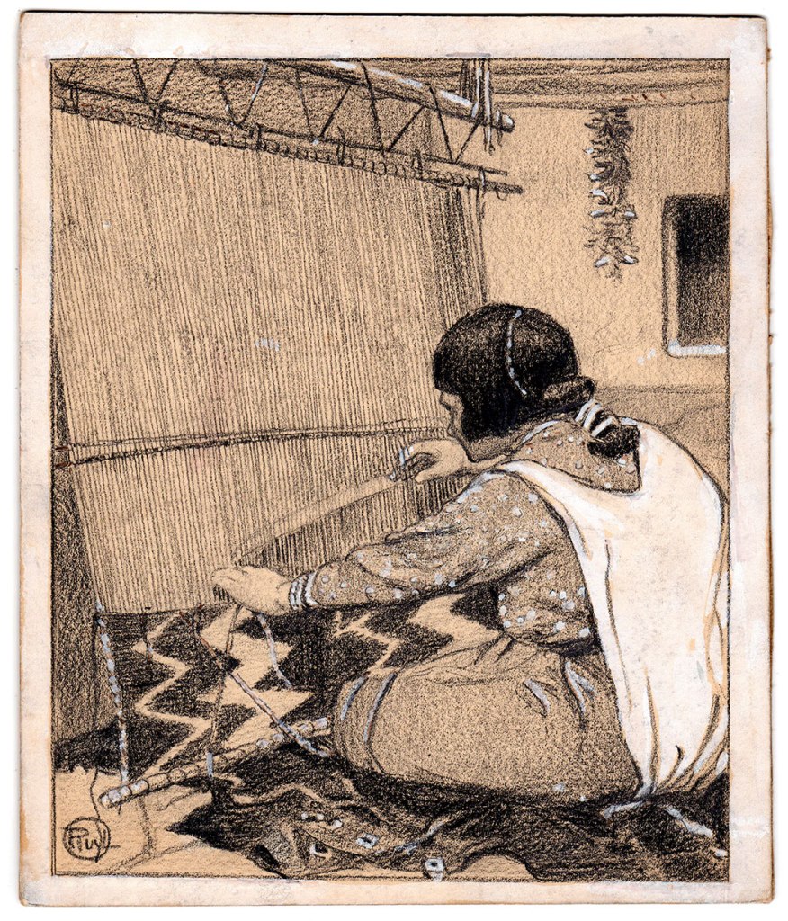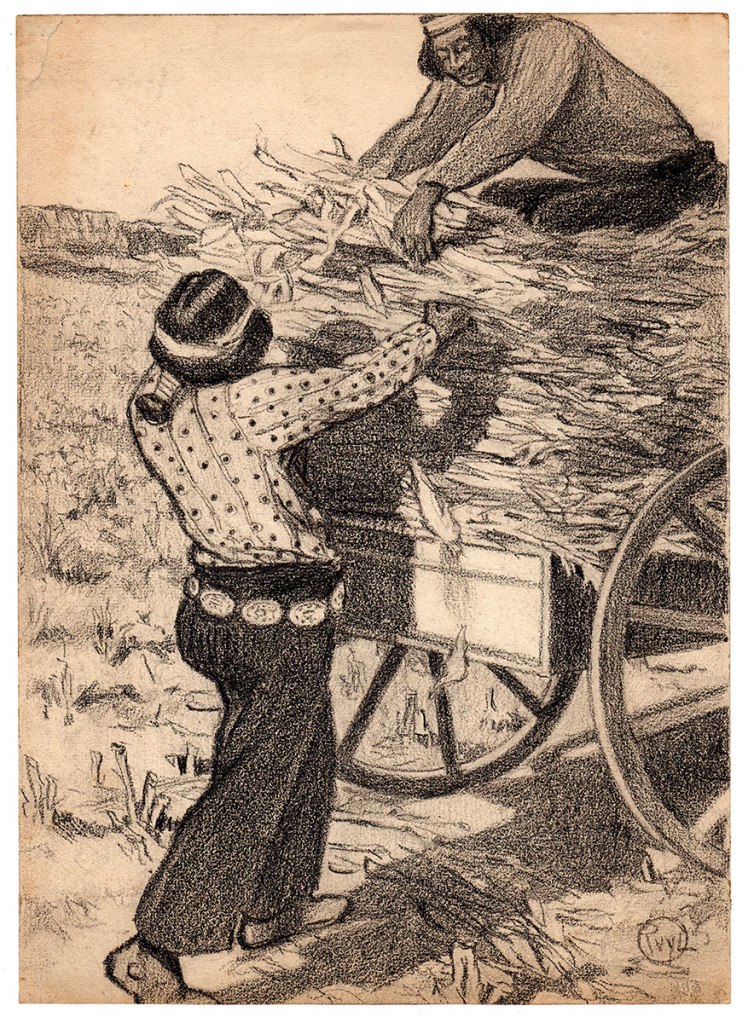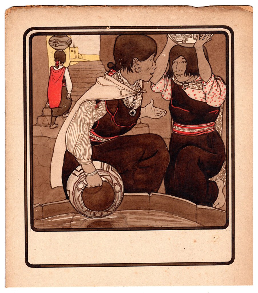 Beatrice was inspired by the culture of the Zuni Pueblo. In 1901, she produced a series of watercolors and charcoal sketchings of the Zuni people which may have been intended for a book that was never completed. She made special note of mothers with children, including infants in carriers. Frequently the idealized western family dynamic: helpmeet mother, breadwinner father, and children who “work and play”, were emphasized in the scenes she recorded. Beatrice wasn’t working as an anthropologist, rather she interpreted Zuni culture through her own romanticized ideas of rural family life in the American West. However, we can still gain valuable historical information from her artwork about both Zuni and Beatrice’s culture.