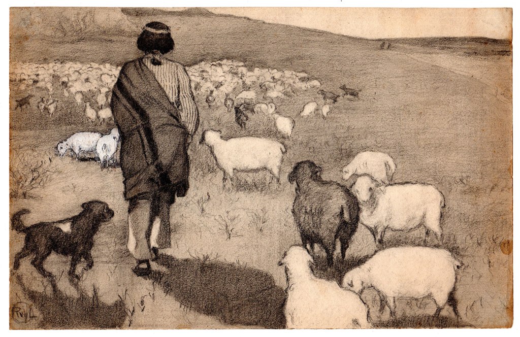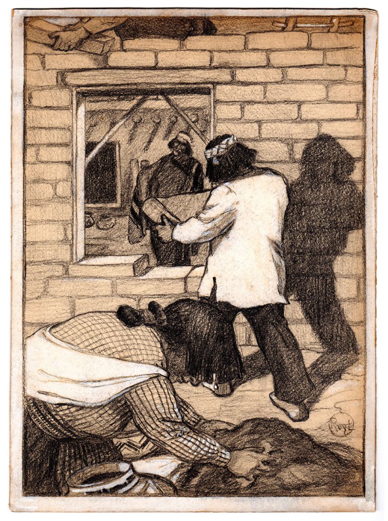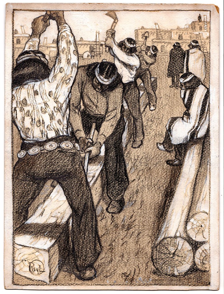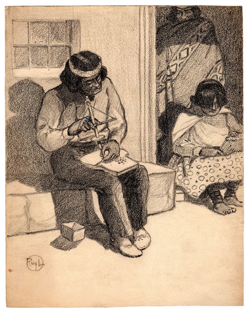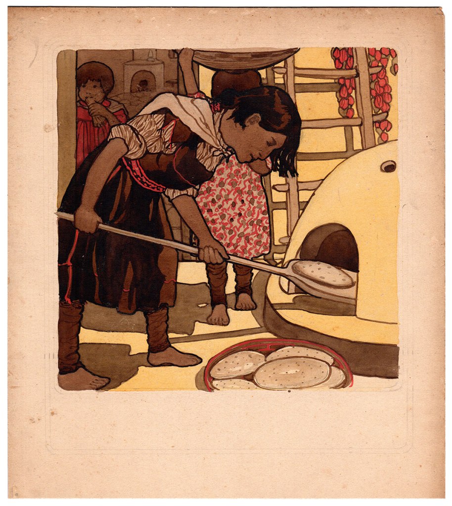 Beatrice was inspired by the culture of the Zuni Pueblo. In 1901, she produced a series of watercolors and charcoal sketchings of the Zuni people which may have been intended for a book that was never completed. She made special note of mothers with children, including infants in carriers. Frequently the idealized western family dynamic: helpmeet mother, breadwinner father, and children who “work and play”, were emphasized in the scenes she recorded. Beatrice wasn’t working as an anthropologist, rather she interpreted Zuni culture through her own romanticized ideas of rural family life in the American West. However, we can still gain valuable historical information from her artwork about both Zuni and Beatrice’s culture.