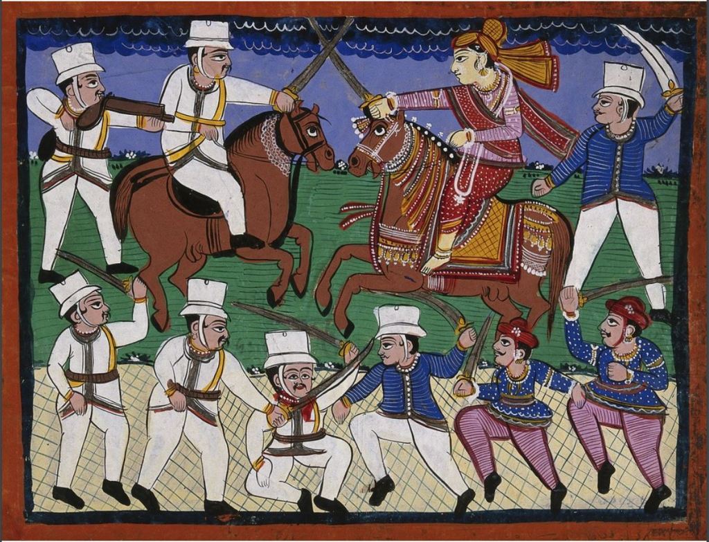 She was very active as queen, known to engage in weightlifting, wrestling, and steeplechasing for pre-breakfast exercise. She dressed simply, managed her work professionally, and drilled and trained her own regiment of female guards (female guards weren’t unusual for the female quarters of the palace but the Rani being involved in their training was). Her horsemanship was infamous, she was said to have been able to ride a horse, “‘with the reins in her teeth and two swords in her hand.’”