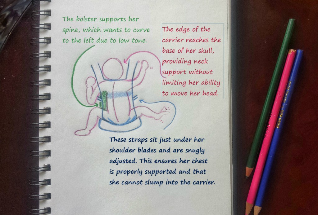 The second carrier was the Tula Free-to-Grow (photo and diagram above). We placed her in it the same as the preschooler SSC but this time the body of the carrier fitted Emily’s body much closer for better support. For a child without cerebral palsy, it may have been on the snug side, but for Emily, this was exactly what she needed. To further support her spine, we rolled up a burp cloth and used it as a bolster between the webbing of the shoulder strap and her ribs, to help prevent her left-lean.