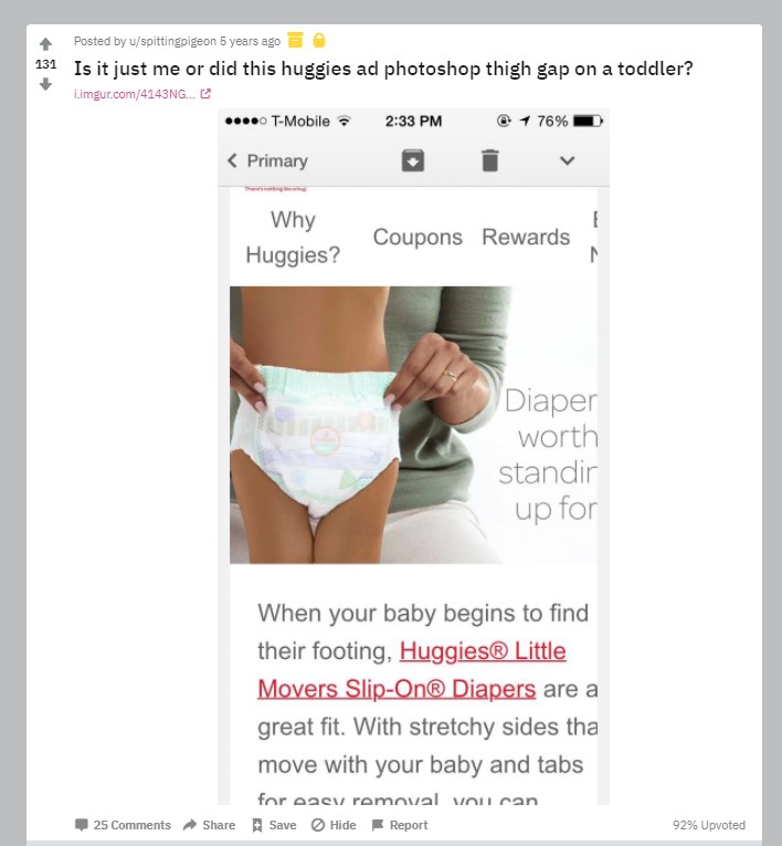 In October of 2015, a Reddit user, spittingpigeon, a mom of an 11-month-old from California named Melody, accused Huggies of photoshopping a ‘thigh gap’ onto a toddler in an advertisement for a slip-on diaper. At the time, the ‘thigh gap’ was the persona non grata of social media “body positivity” and it was perfectly acceptable to tell women with a thigh gap that they needed to eat a cupcake. With regards to spittingpigeon’s accusation, unlike with the WAPs in the 1980s, Huggies responded. Spokesperson Terry Balluck made a statement assuring people that the image of the toddler had not been altered. Meanwhile, Reddit commenters on the original post had already said that their own normal-weight toddlers had thigh gaps too.