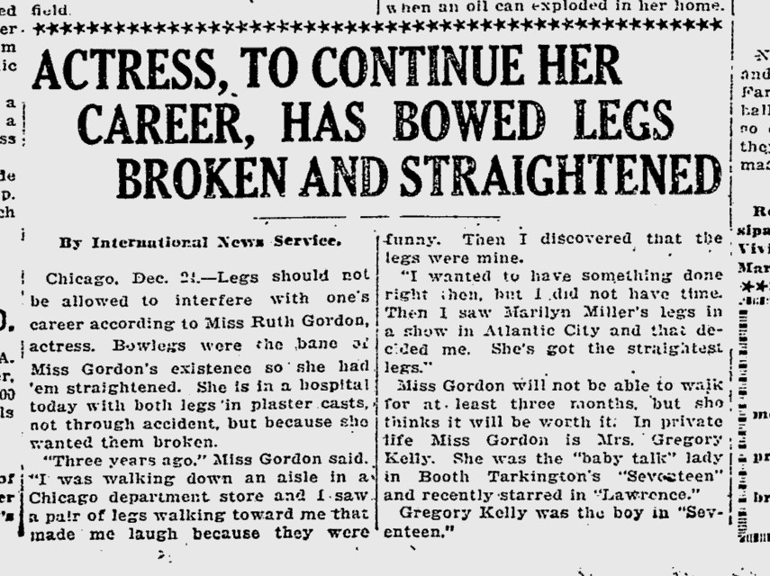 International News Service. 24 Dec 1920. “Actress, To Continue Her Career, Has Bowed Legs Broken and Straightened.” Pittsburgh Press. Newspaper Archive.
