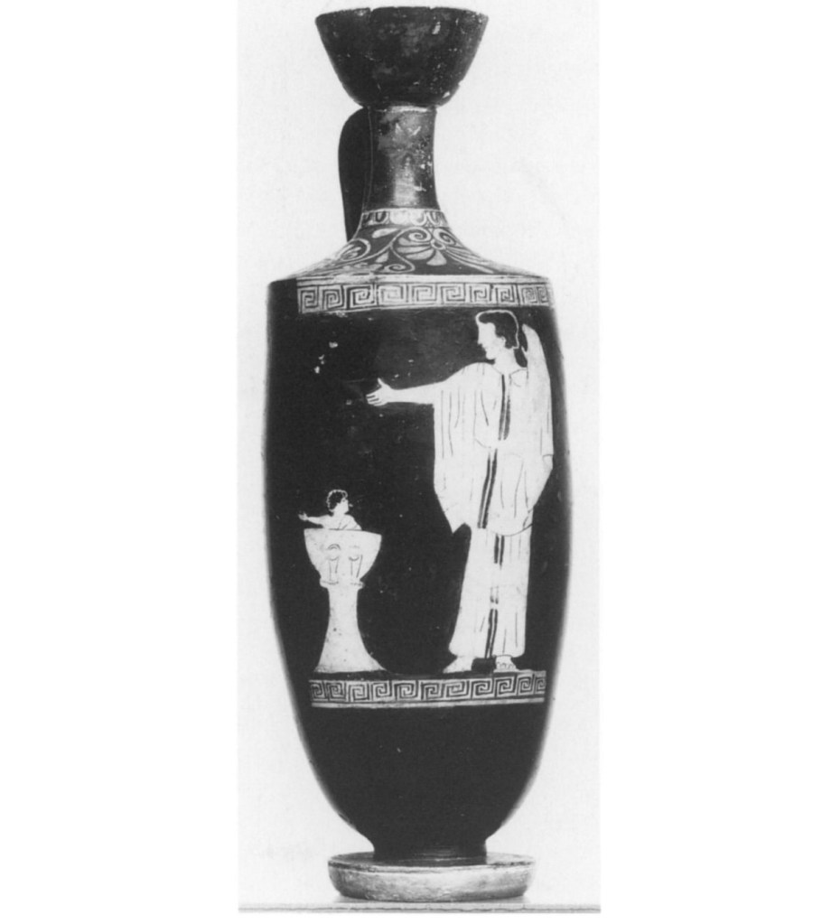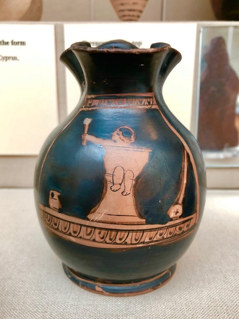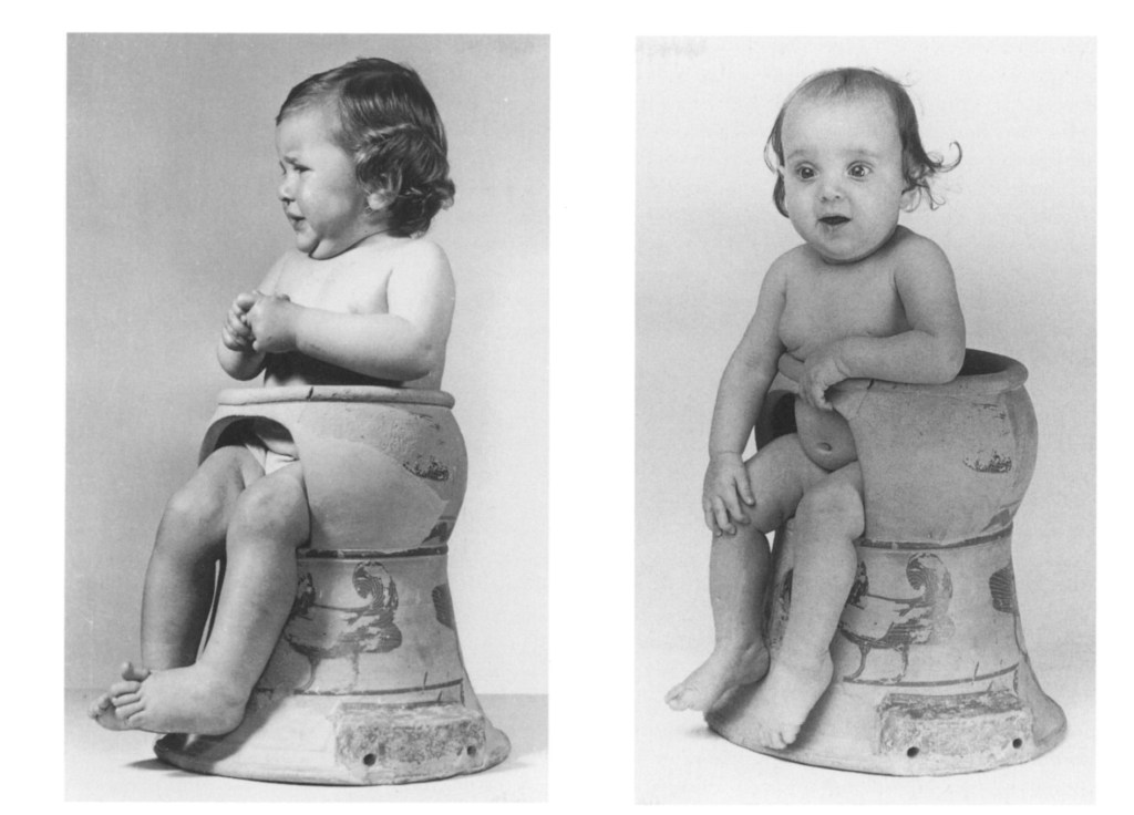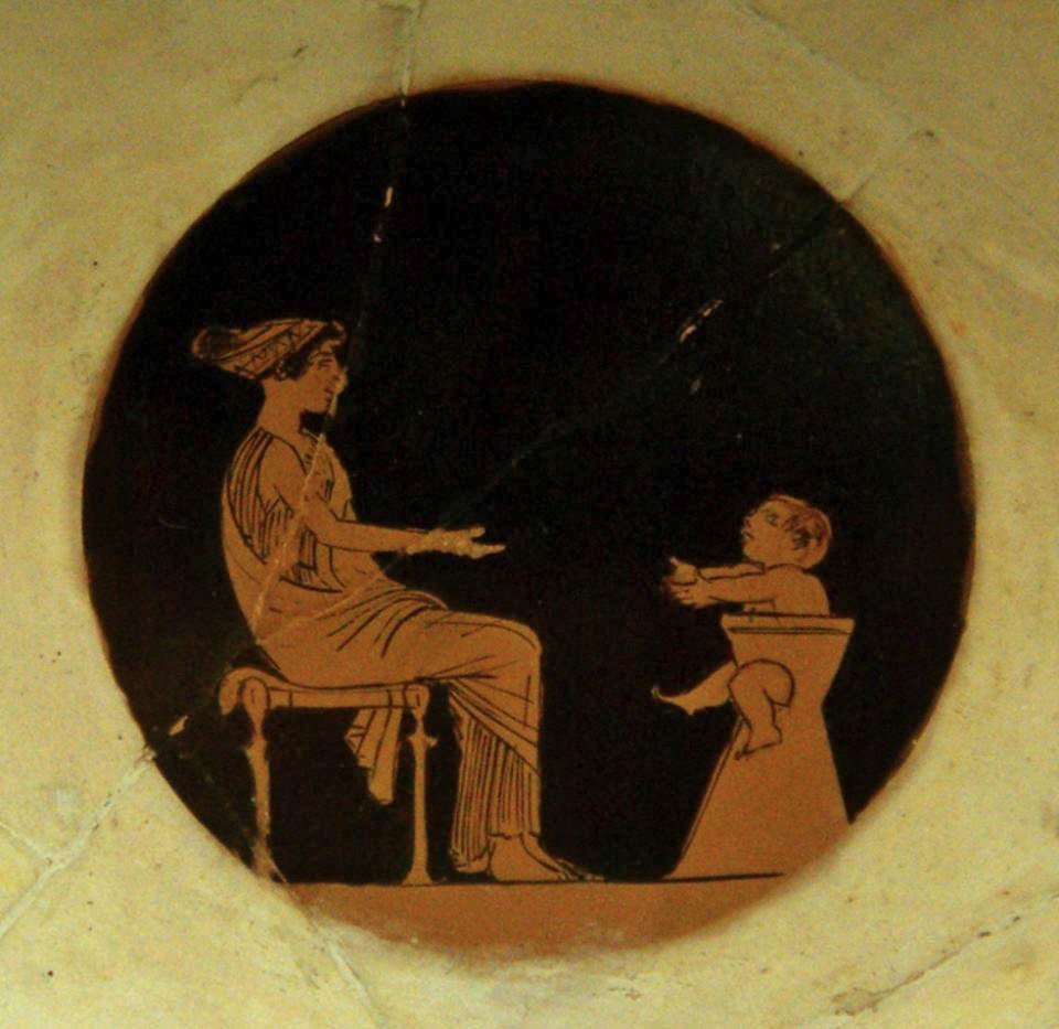 In ancient Greece, baby potties doubled as baby chairs, on this wine jug, or chous, from the 5th century bce, the baby is playing with a rattle.