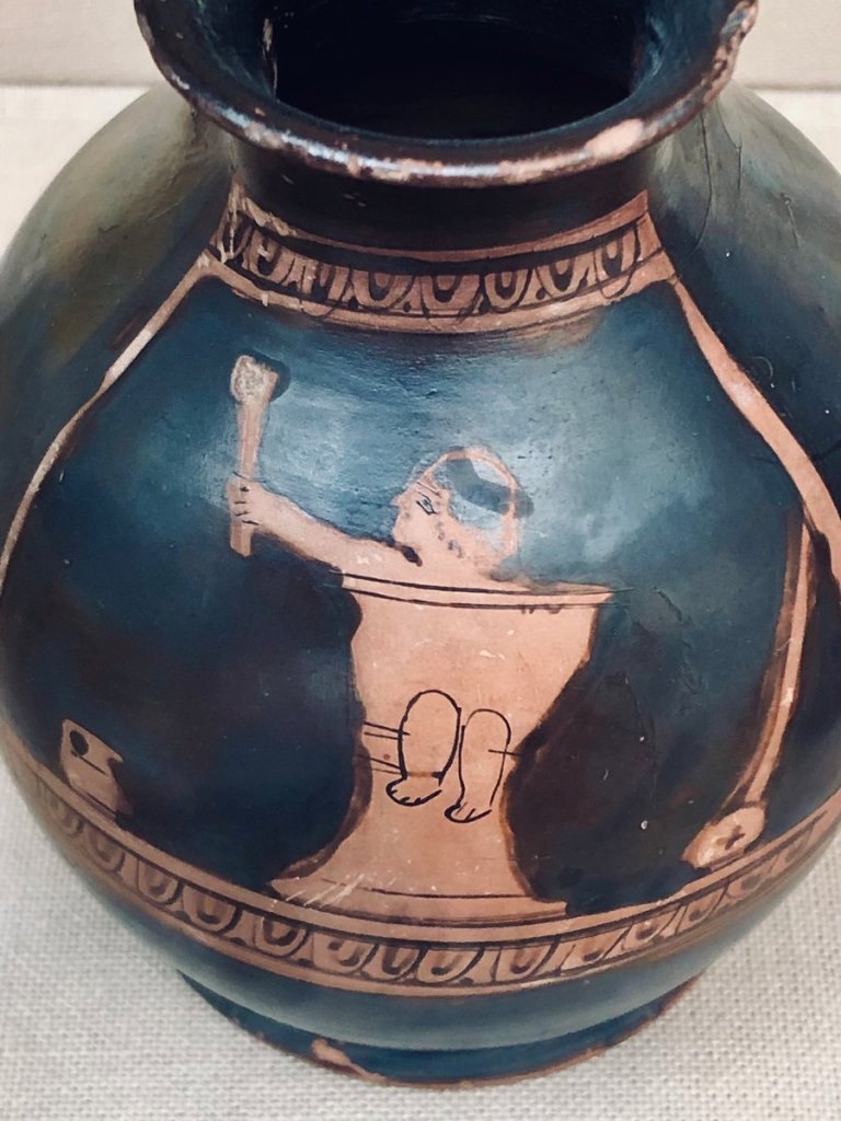 And on this oil jug, a woman stands next to a baby (this time clothed) in a potty chair.