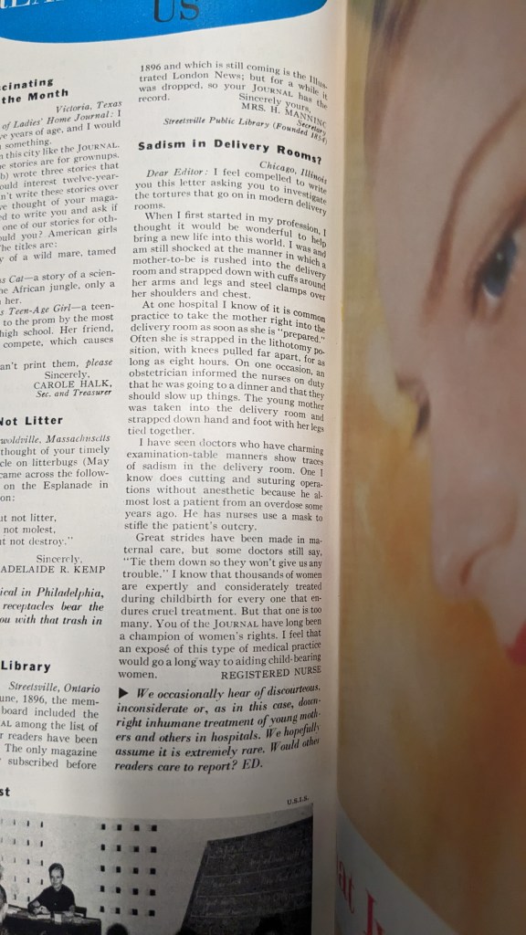 In November of 1957, the Ladies Home Journal published a short but pointed letter from Registered Nurse asking them to do an investigation of “Sadism in Delivery Rooms”. The editorial staff of the journal hoped that that what she described wasn’t common and asked readers to write in telling their experiences.