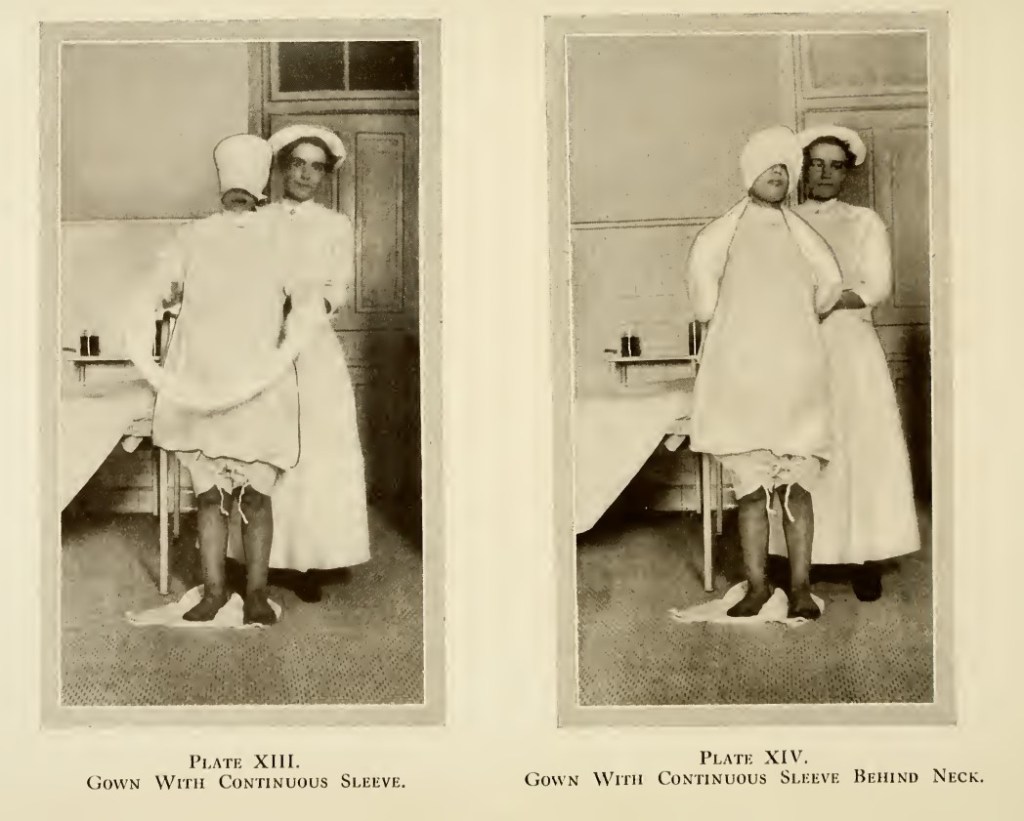 Above images are from Bertha Van Hoosen’s 1915 book Scopolamine- Morphine Anesthesia. The patient is restrained and left alone until delivery was imminent, then restrained in the lithotomy position and draped with sterile cloths. This was a time before antibiotics and limited antiseptics. The “sterile drapes” may have done something but seem more likely to be a means of dehumanizing (possibly desexualizing) the woman who is giving birth. It’s just a vagina (interestingly, unshaved), and not a person.