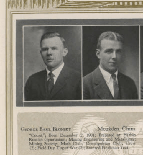 George Blonsky, was born on December 2nd of 1901 in China to Russian parents. After attending a Russian prep school and earning his degree at MIT (class of 1926) he began a career as a mining engineer, traveling all over the world, including Korea, Alaska, Arizona, and Montana with his wife Charlotte (called Lotte).1