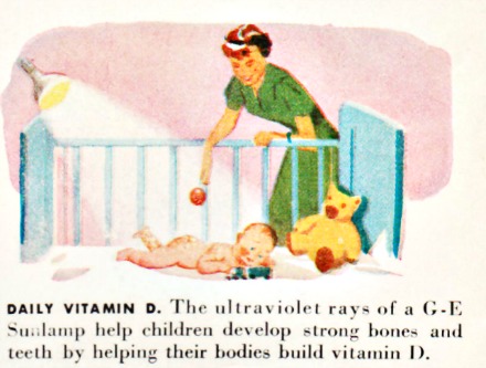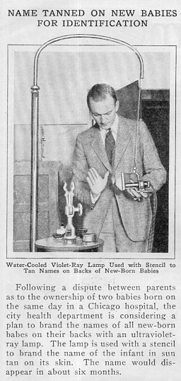 Other ideas included branding newborns’ initials with UV light {similar to how ranchers branded their cattle) sometimes called the “stencil method.” This was during an era where medical consensus was that UV light was healthy for babies, advice included leaving naked infants outside in full sun for hours a day, or in less favorable climates, to attach sun lamps to cribs so they would make more vitamin D and prevent rickets. However, recent studies show that no amount of sun exposure can remedy a lack of dietary vitamin D, and there’s no safe amount of UV exposure from the sun, especially for babies.