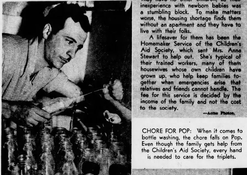 The boys were named Tommy, Thenny, and George. The Children’s Aid Society sent a helper, Mrs Anna Stewart, through their Homemaker Service. She functioned of something like a post partum doula might today. In the New York Times, the Children’s Aid society explained, the service was through their foster care program, providing “‘substitute mothers’ in families where the homemakers, confronted with serious extra responsibility or with misfortune, needs help to keep her home functioning and family intact.”