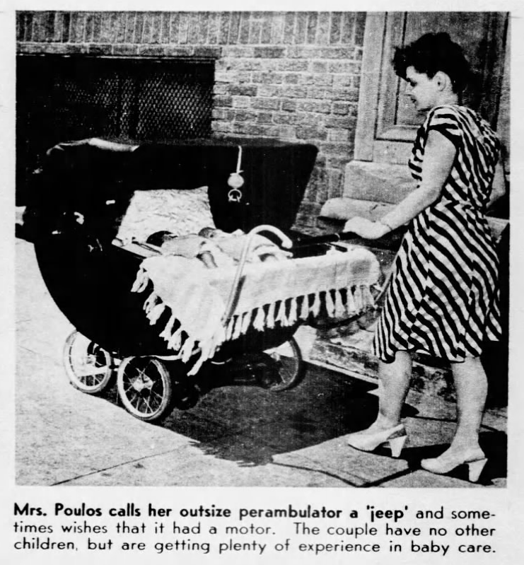 Nora and Arris Poulos lived in New York City, he was a 27 years old veteran having served overseas during WWII. Now they were ready to start their family… and how. On April 22nd 1946, at Lutheran Hospital* in New York City, Dr Carl Strauss delivered 24 yo Nora of triplets, all boys.. and then he caught Arris when he fainted on seeing his sons (but one source claims it was “feigned” shock.)